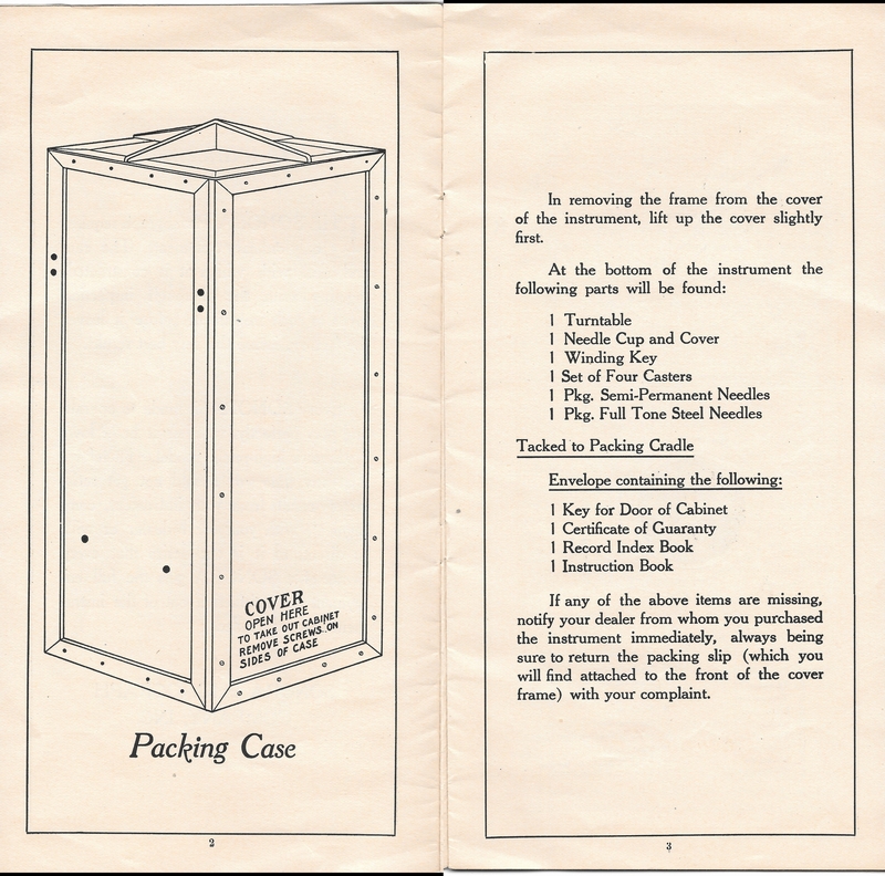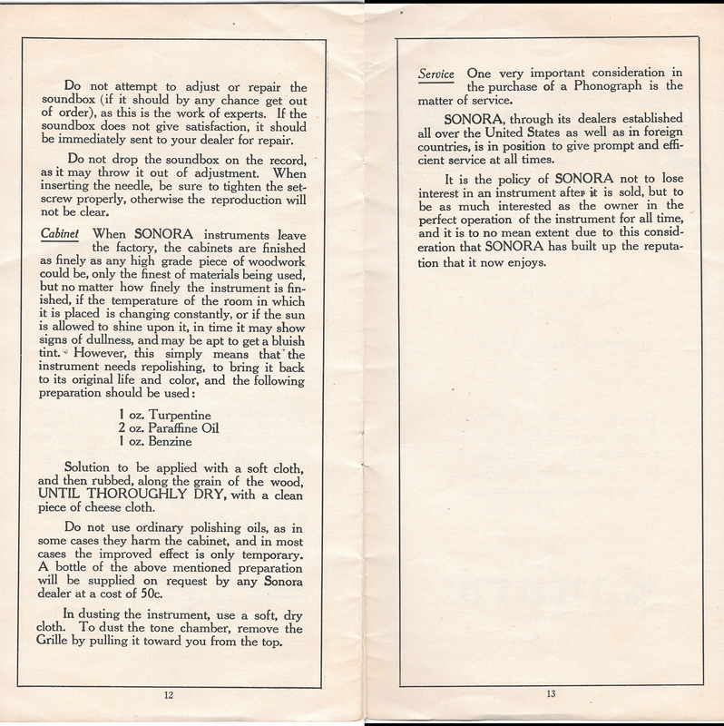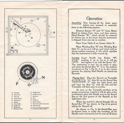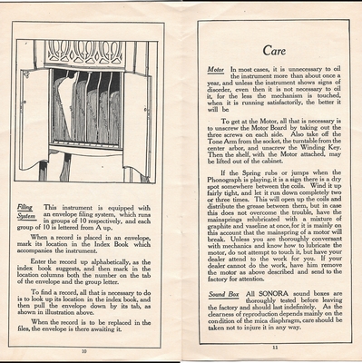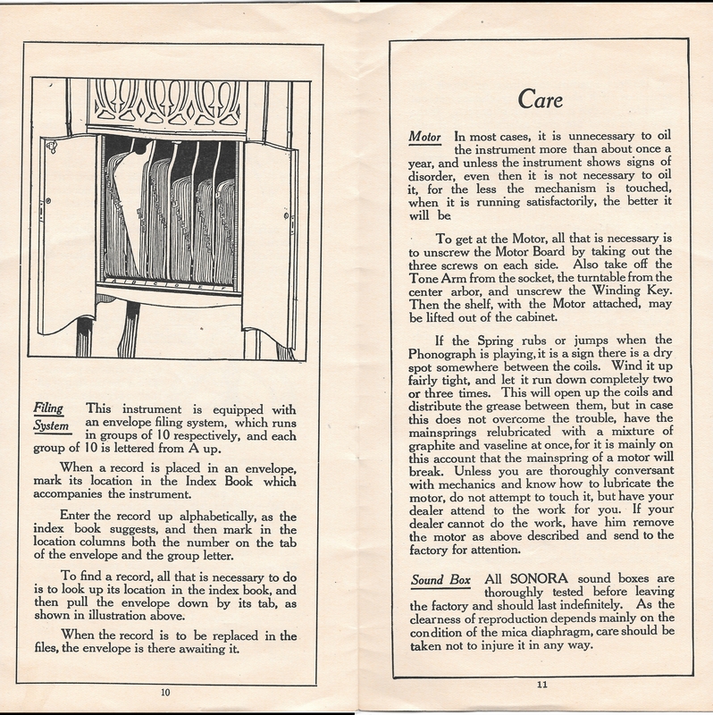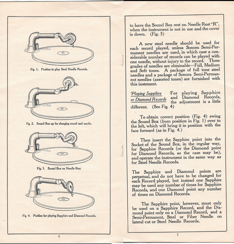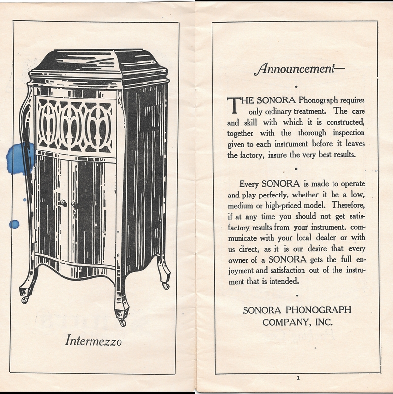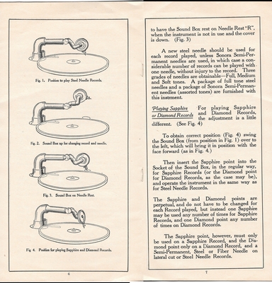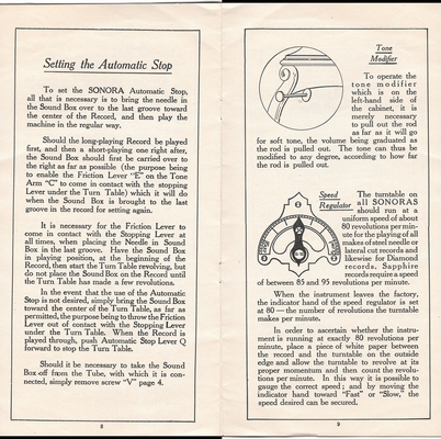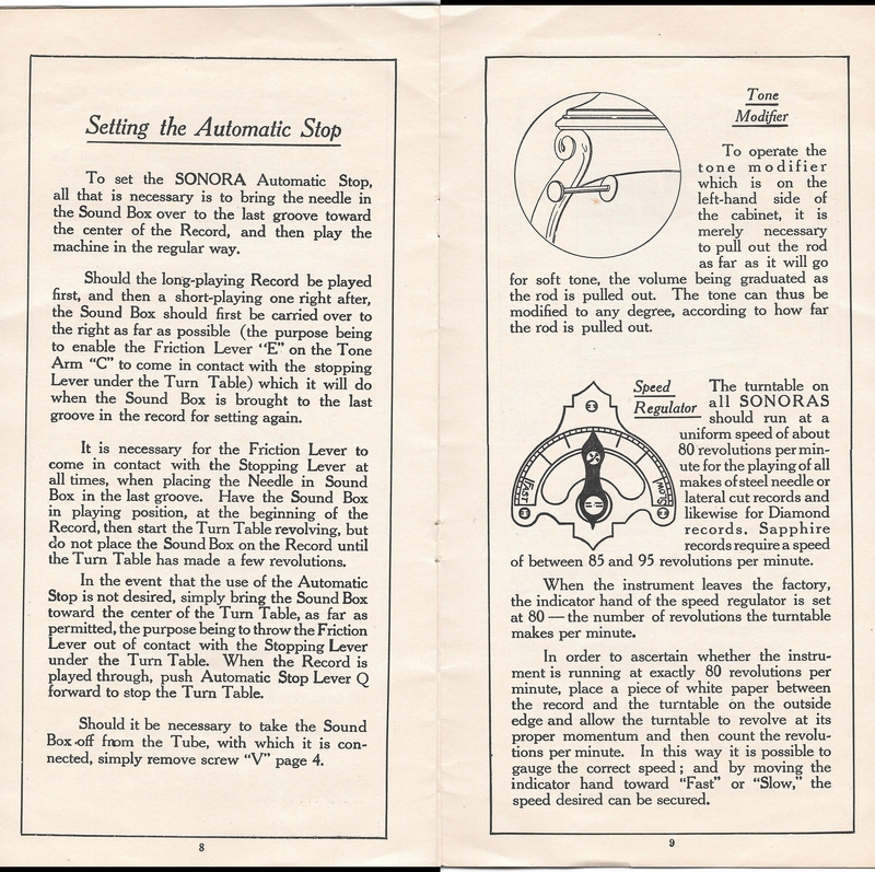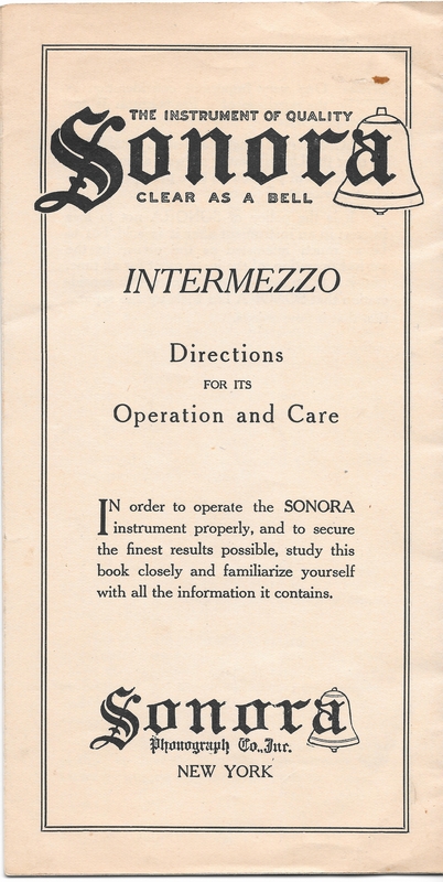 Here is an owner's manual for a 1920's Sonora 'Intermezzo' model spring motor phonograph. You can click on the images for an enlarged image.